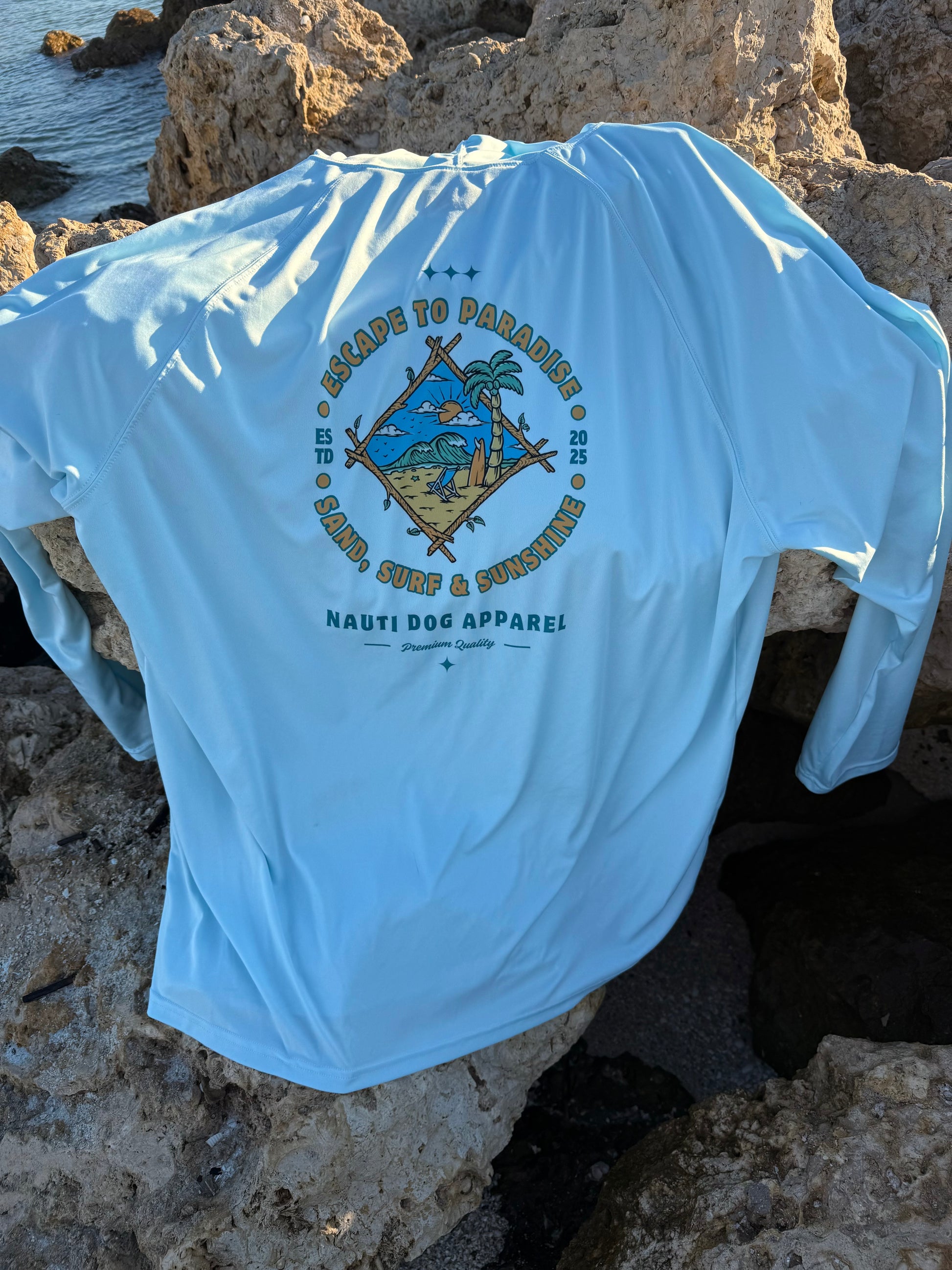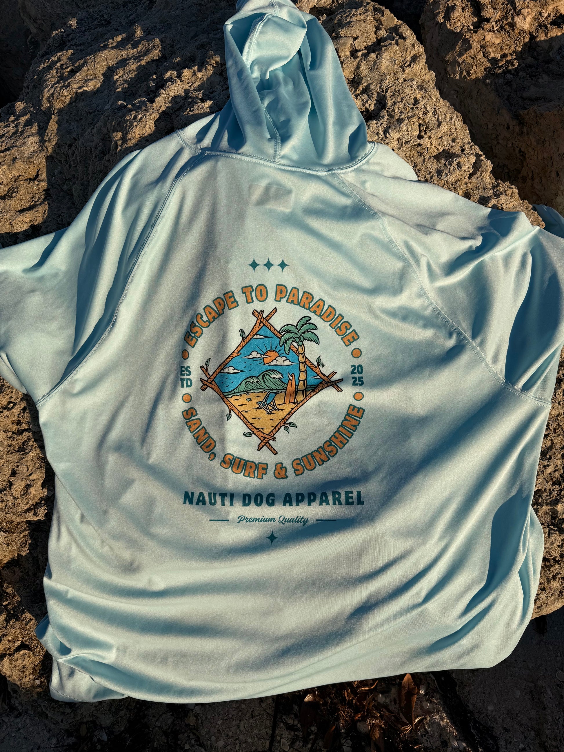 The Escape to Paradise hoodie was created for early mornings, salty air, and the feeling that life doesn’t have to be rushed. A classic coastal badge design paired with lightweight performance fabric makes this an everyday go-to—on the beach, on the boat, or just getting away from it all.