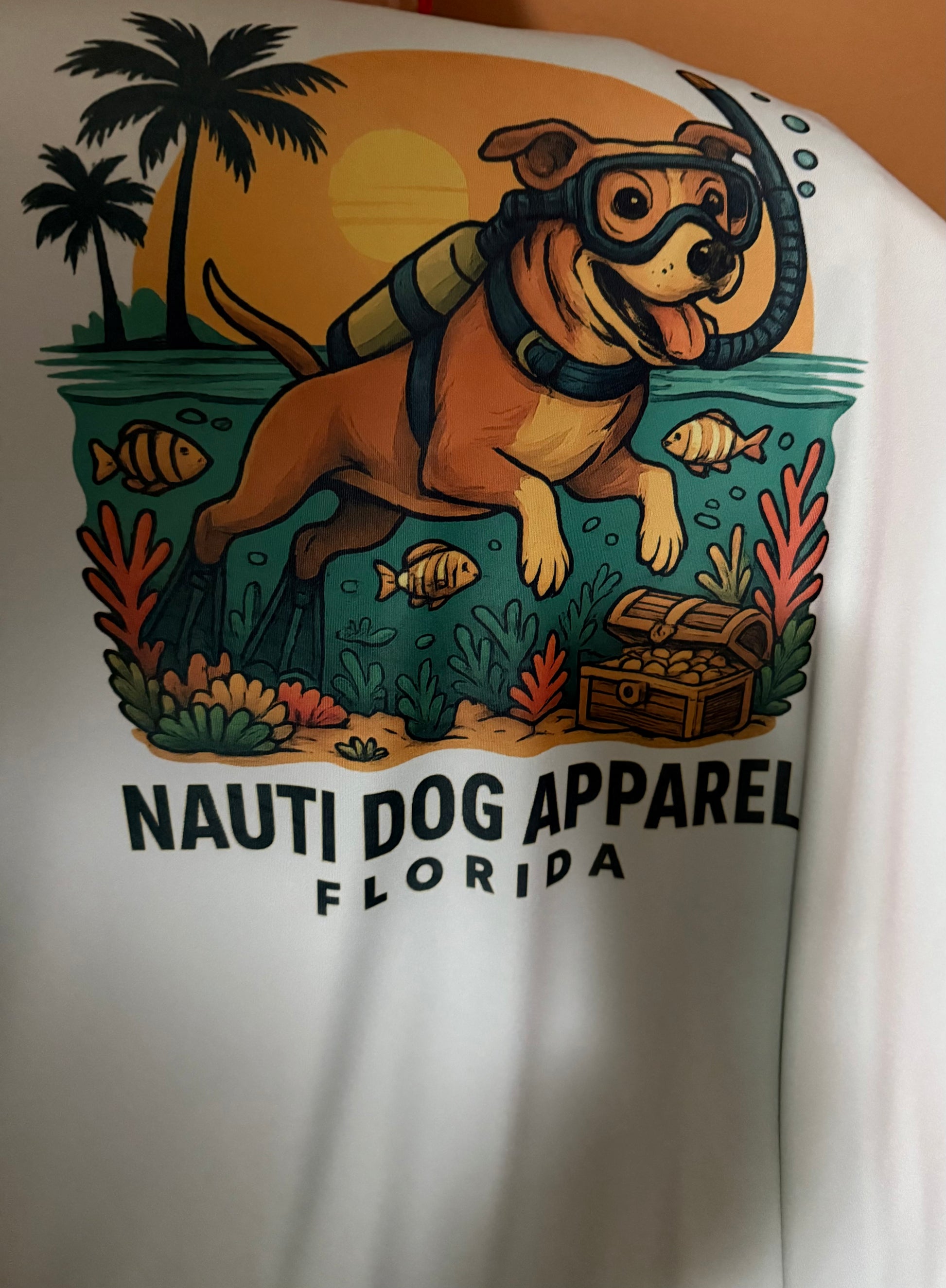 Bring the spirit of Southwest Florida’s sun, sand, and wagging tails straight into your wardrobe with this eye-catching design. Featuring our fearless pup in full scuba gear—snorkel, fins, and all—exploring a vibrant reef complete with coral, tropical fish, and a buried treasure chest, this shirt captures the playful heart of Nauti Dog Apparel.
