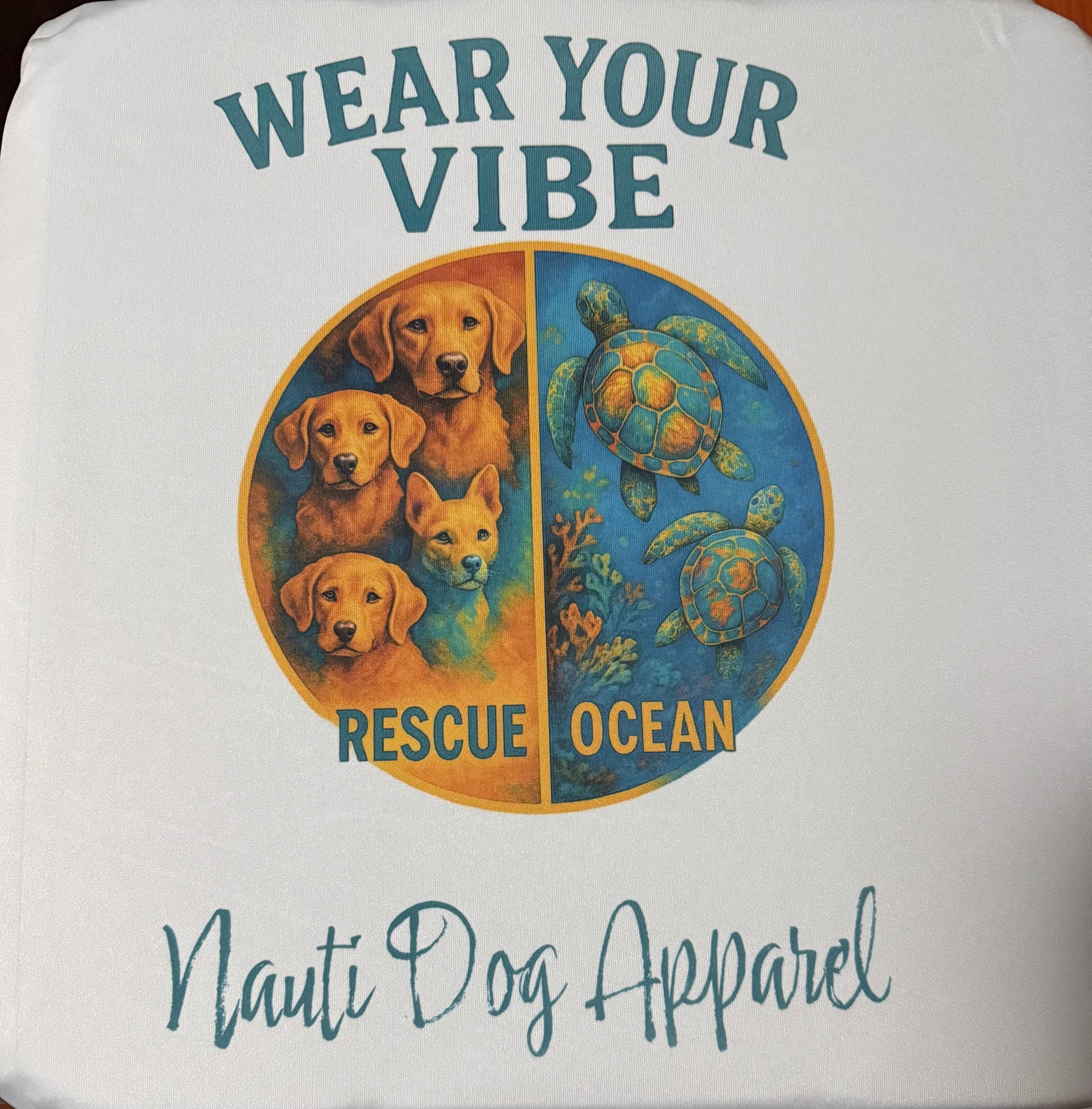 This is more than a shirt—it’s a movement. The “Wear Your Vibe” flagship tee from Nauti Dog Apparel captures the heart of our mission in one powerful design. On one side, rescued dogs symbolize second chances, loyalty, and unconditional love. On the other, vibrant sea turtles glide through thriving coral reefs, reminding us of the urgent need to protect our oceans.